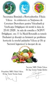 În data de 23 ianuarie 2026, începând cu ora 11.00, Societatea Română a Horticultorilor – Filiala Vâlcea, în colaborare cu Stațiunea de Cercetare-Dezvoltare pentru Viticultură și Vinificație Drăgășani, vă invită la o dezbatere pe probleme horticole la început de an.