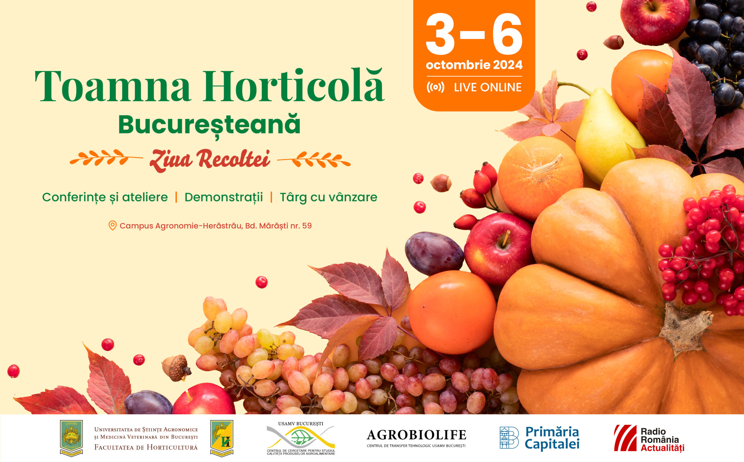 Avem deosebita plăcere de a vă invita la Sărbătoarea Horticolă a Toamnei și a Recoltei, în minunatul cadru al Campusului Agronomie-Herăstrău al Universității de Științe Agronomice și Medicină Veterinară din București, B-dul. Mărăști Nr. 59. Toamna Horticolă Bucureșteană – Ziua Recoltei 3– 6 octombrie 2024 Studenți, cercetători, fermieri și pasionați de horticultură își dau întâlnire […]